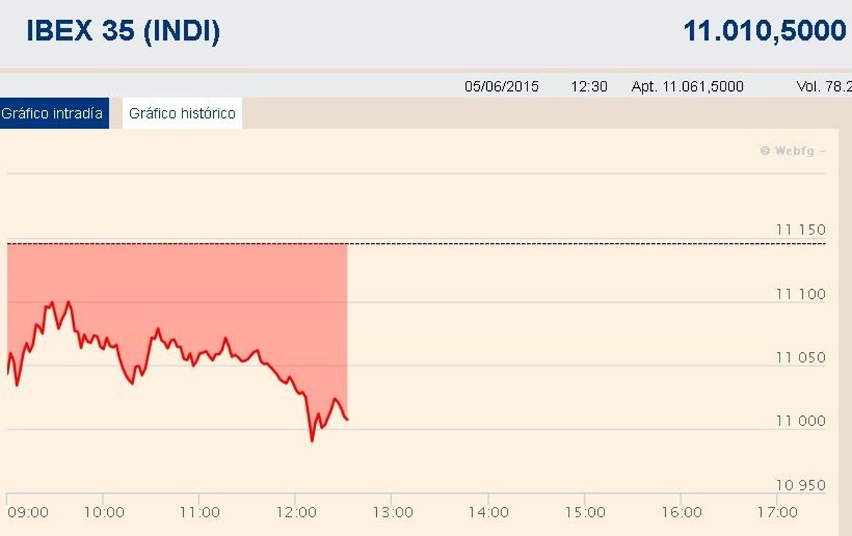 El Ibex 35 cedía más de un 1% a media sesión y se situaba al borde de perder la barrera psicológica de los 11.000 puntos, ante el estancamiento en el acuerdo entre Grecia y sus acreedores. Mientras, la prima de riesgo española se estabilizaba en los 127 puntos básicos.