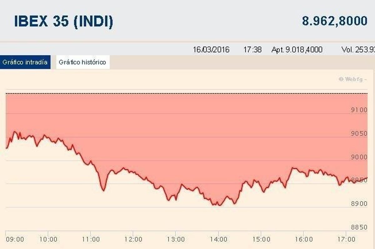 MADRID, 16 Mar. (EUROPA PRESS) - El Ibex 35 ha cedido un 0,28% al cierre de mercado y se ha anotado su segunda jornada consecutiva en negativo, con lo que el selectivo se ha atascado por debajo de los 9.000 puntos. Mientras, la prima de riesgo española se mantenía estable en los 119 puntos básicos. Banco Santander ha liderado los recortes, al ceder un 2,3%. Caixabank, Iberdrola y Acciona se han dejado más de un 1%, hasta completar la lista de las cuatro principales caídas de la jornada. Le han seguido BBVA (-0,6%) y OHL (-0,4%). En el lado opuesto, las mayores ganancias las han registrado IAG (+2,5%) y Bankia (+2%). En una jornada sin grandes protagonistas, Sacyr, Mapfre, Indra y Mediaset han sumado más de un 1%. Con los inversores pendientes de la reunión de la Reserva Federal, en la que no se espera otra subida de los tipos de interés, las principales Bolsas de Europa han mostrado un comportamiento dispar. Londres y Francfort han sumado cerca de un 0,5%, mientras que París y Milán se han decantado por las pérdidas, con descensos del 0,2%. En el mercado de divisas, el euro perdía posiciones respecto al dólar y la moneda única europea se intercambiaba por 1,1081 unidades al cierre de sesión.