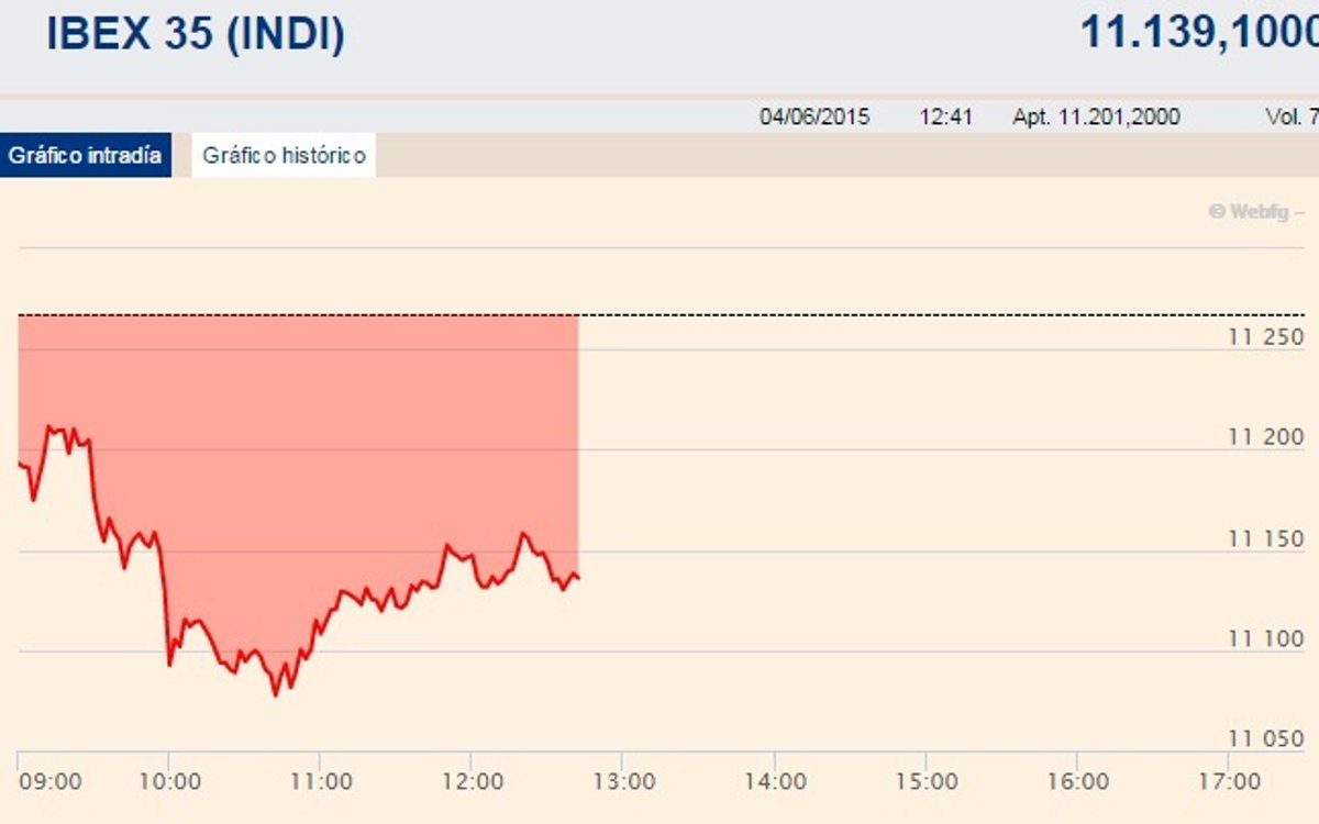 El Ibex 35 retrocedía un 1,08% a media sesión, lo que le llevaba a cotizar en los 11.146,4 enteros a las 12.27 horas, al tiempo que la prima de riesgo caía ligeramente hasta los 123,50 puntos básicos, con el interés del bono español en máximos anuales, en el 2,17%.