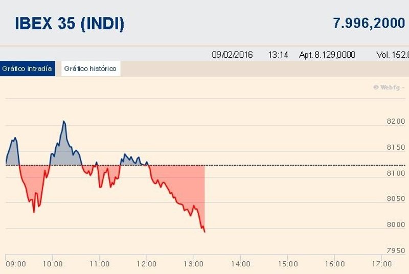 El Ibex 35 cedía un 1,84% a una hora del cierre, lo que llevaba al selectivo a pelear por conquistar nuevamente los 8.000 enteros (7.972,7) y a liderar los recortes en Europa.