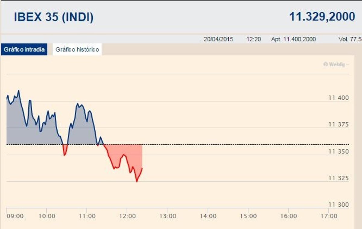 El Ibex 35 cedía un 0,23% en la media sesión de este lunes, lo que llevaba al selectivo a alejarse de los 11.400 enteros (11.333,2) por el temor a la evolución de las negociaciones sobre Grecia.