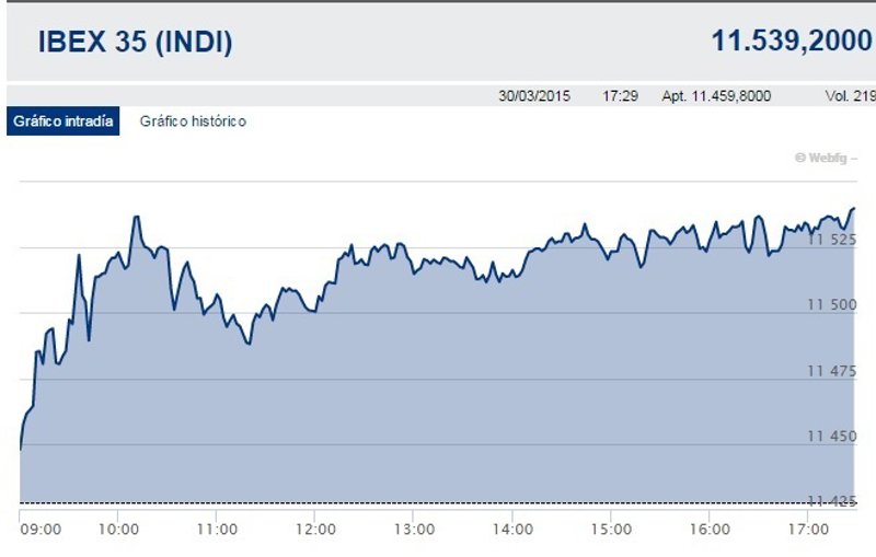 El Ibex 35 ha cerrado la sesión de este lunes con un repunte del 0,89%, lo que ha llevado al selectivo a situarse nuevamente por encima de los 11.500 enteros (11.529,1) y a mantenerse en máximos de cinco años.