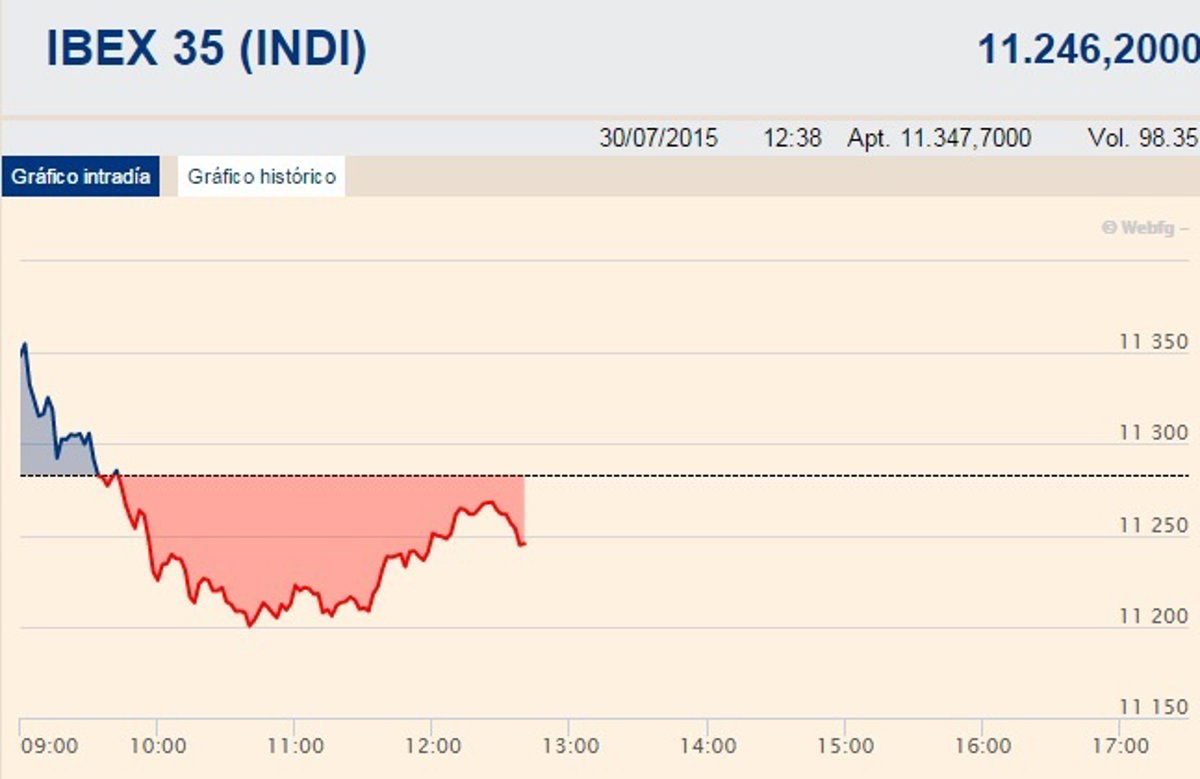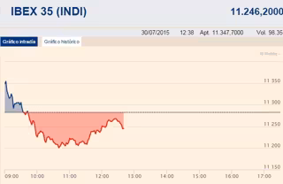 El Ibex 35 invertía la tendencia a media sesión y se dejaba un 0,2% a las 12.34 horas, lo que llevaba a situarse en los 11.260,1 enteros, mientras que la prima de riesgo bajaba ligeramente hasta los 120,30 puntos básicos, con el interés del bono a diez años en el 1,92%.