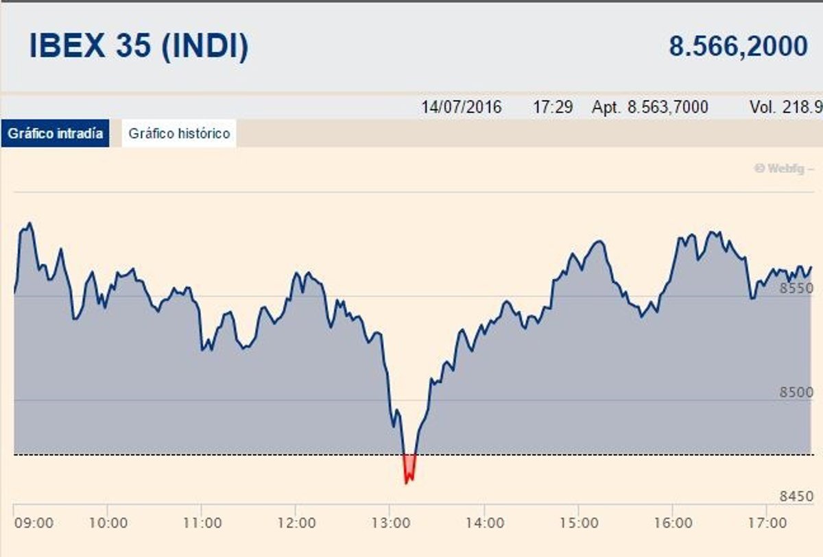 El Ibex 35 ha cerrado la sesión de este jueves con un avance del 0,93%, lo que ha llevado al selectivo a afianzar los 8.500 enteros (8.552,3) tras la buena apertura del Wall Street y el impulso de los 'blue chips'.