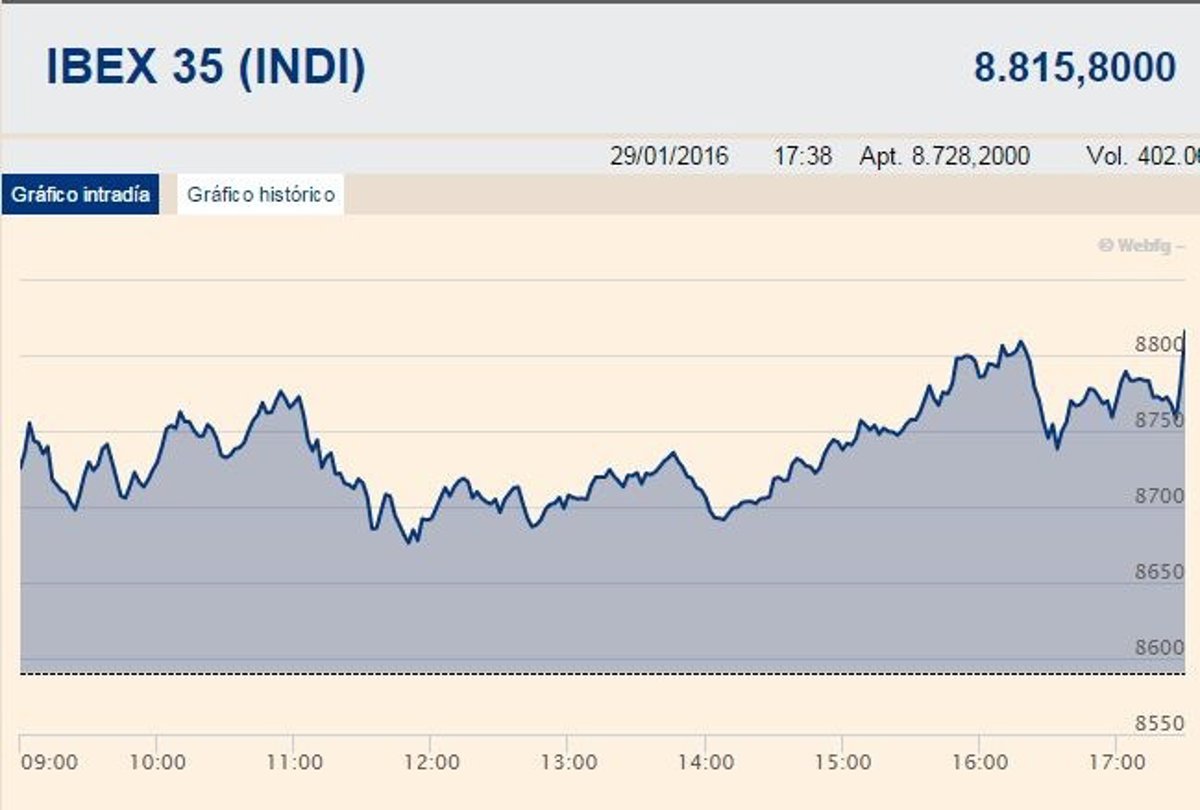 El Ibex 35 ha cerrado la sesión de este viernes con un repunte del 2,62%, lo que ha llevado al selectivo a situarse por encima de los 8.800 enteros (8.815,8) gracias al empujón de Gamesa y de la banca mediana.