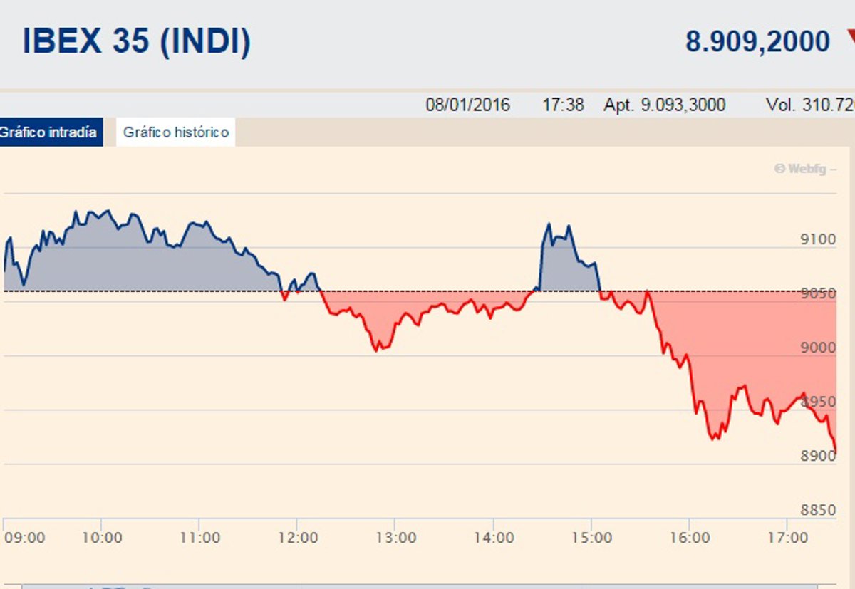 En las primeras cinco sesiones del año, el selectivo madrileño ha retrocedido desde los 9.544 puntos en los que cerró el año y se ha anotado además su peor semana desde diciembre de 2014. El Ibex ha cedido la barrera psicológica de los 9.000 enteros y partirá el próximo lunes desde los 8.900 puntos.