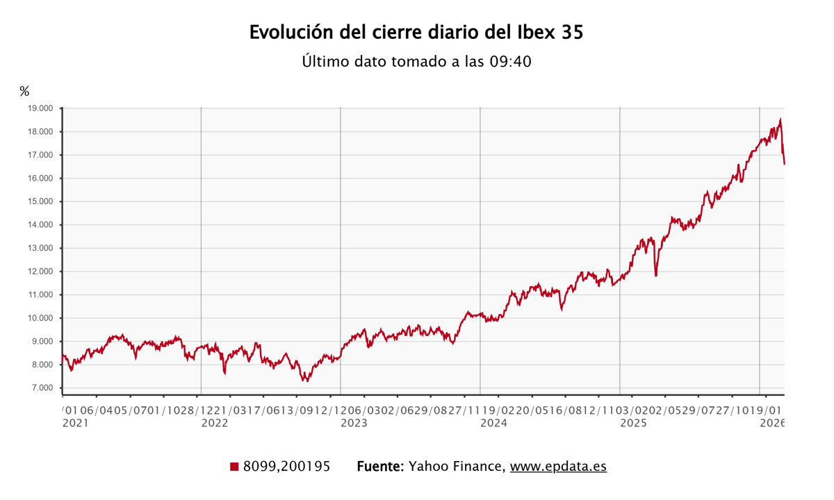 El Ibex ha abierto en estos niveles después de que el pasado viernes cerrase la semana con una pérdida del 7,01%, lo que supone el peor registro semanal en los últimos cuatro años.