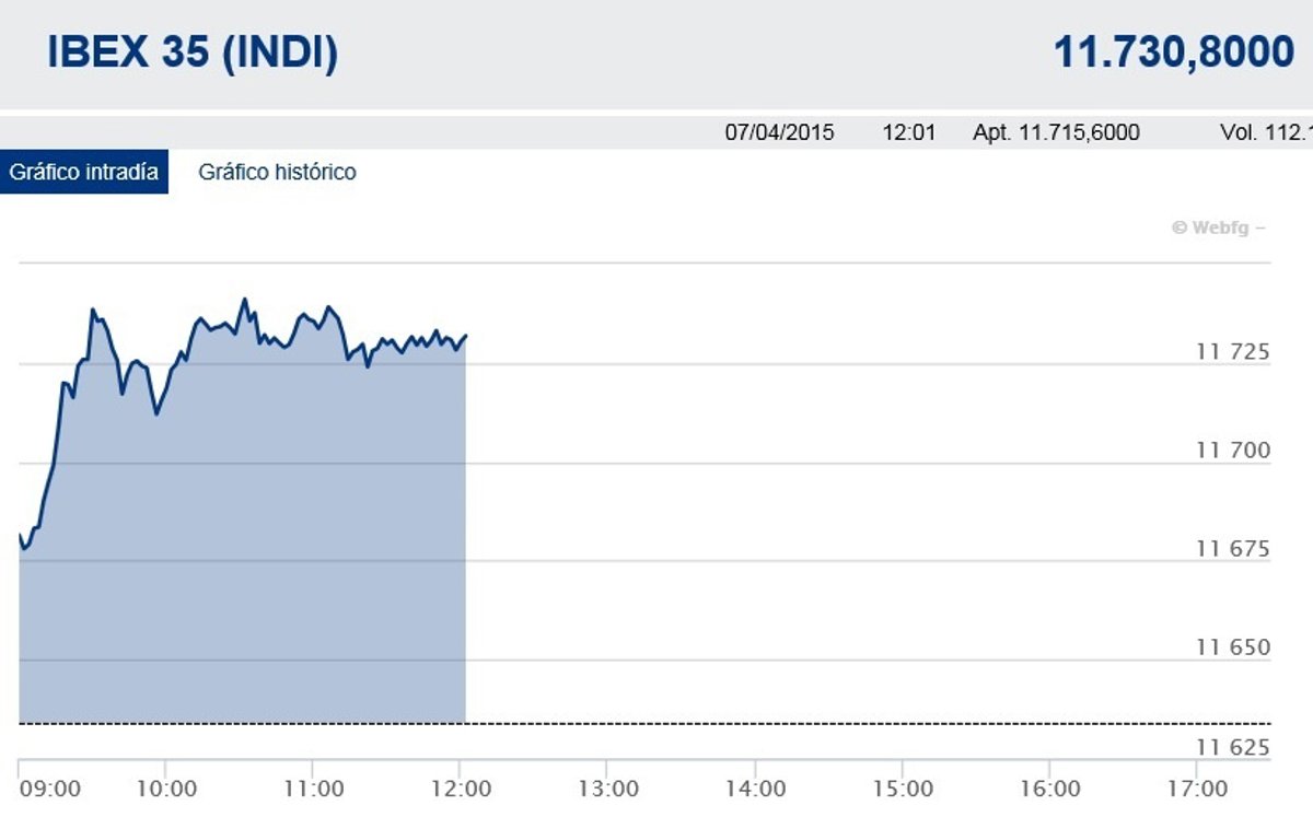 El Ibex 35 se impulsaba cerca de un 1% a media sesión y consolidaba los 11.700 puntos, máximos de cinco años, en su primera sesión de la semana tras la festividad del Lunes de Pascua. La prima de riesgo española proseguía también con su mejoría y se situaba en el entorno de los 100 puntos básicos.