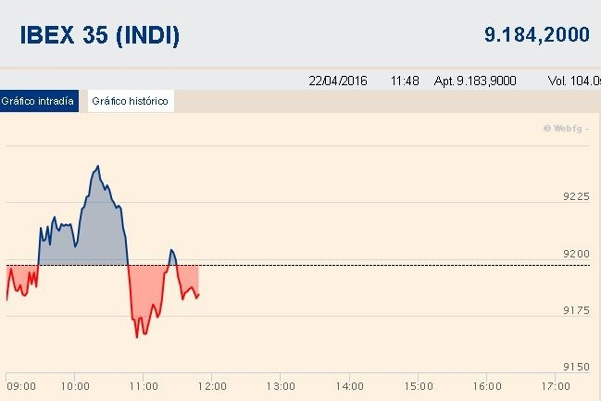 El Ibex 35 mantenía las pérdidas a media sesión y cedía un 0,26%, con lo que se situaba por debajo de los 9.200 puntos. El selectivo, tras la reunión intrascendente del BCE, luchaba para no frenar la racha alcista de cuatro sesiones consecutivas.