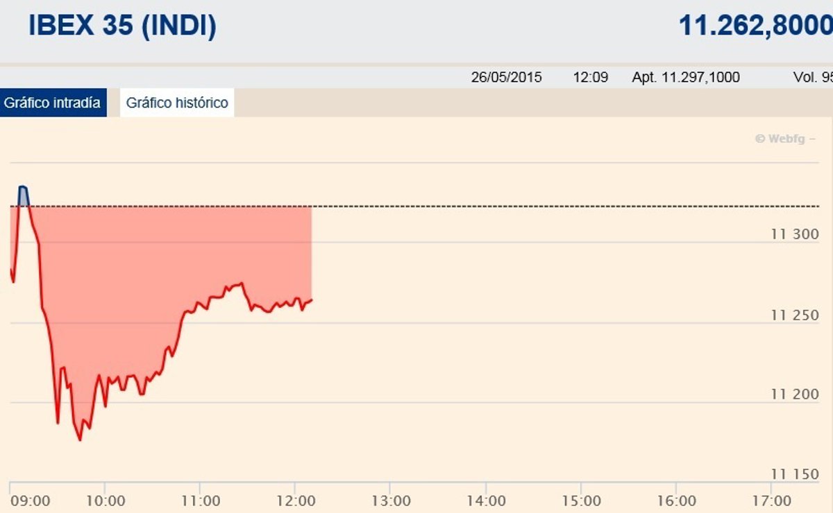 El Ibex 35 mantenía las pérdidas a media sesión (-0,5%) ante el riesgo de impago de Grecia y con el resultado de las elecciones municipales aún resonando en el parqué madrileño. Por su parte, la prima de riesgo española se estabilizaba en los 131 puntos básicos, con la rentabilidad del bono español a 10 años en el 1,85%.