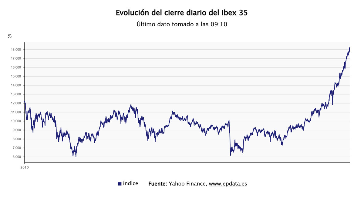 El Ibex 35 ha iniciado la sesión de este martes con una subida del 0,12%, lo que le ha llevado a conquistar la cota psicológica de los 18.200 enteros y marcar nuevos máximos históricos, al situarse en los 18.217,1 puntos a las 9.00 horas.