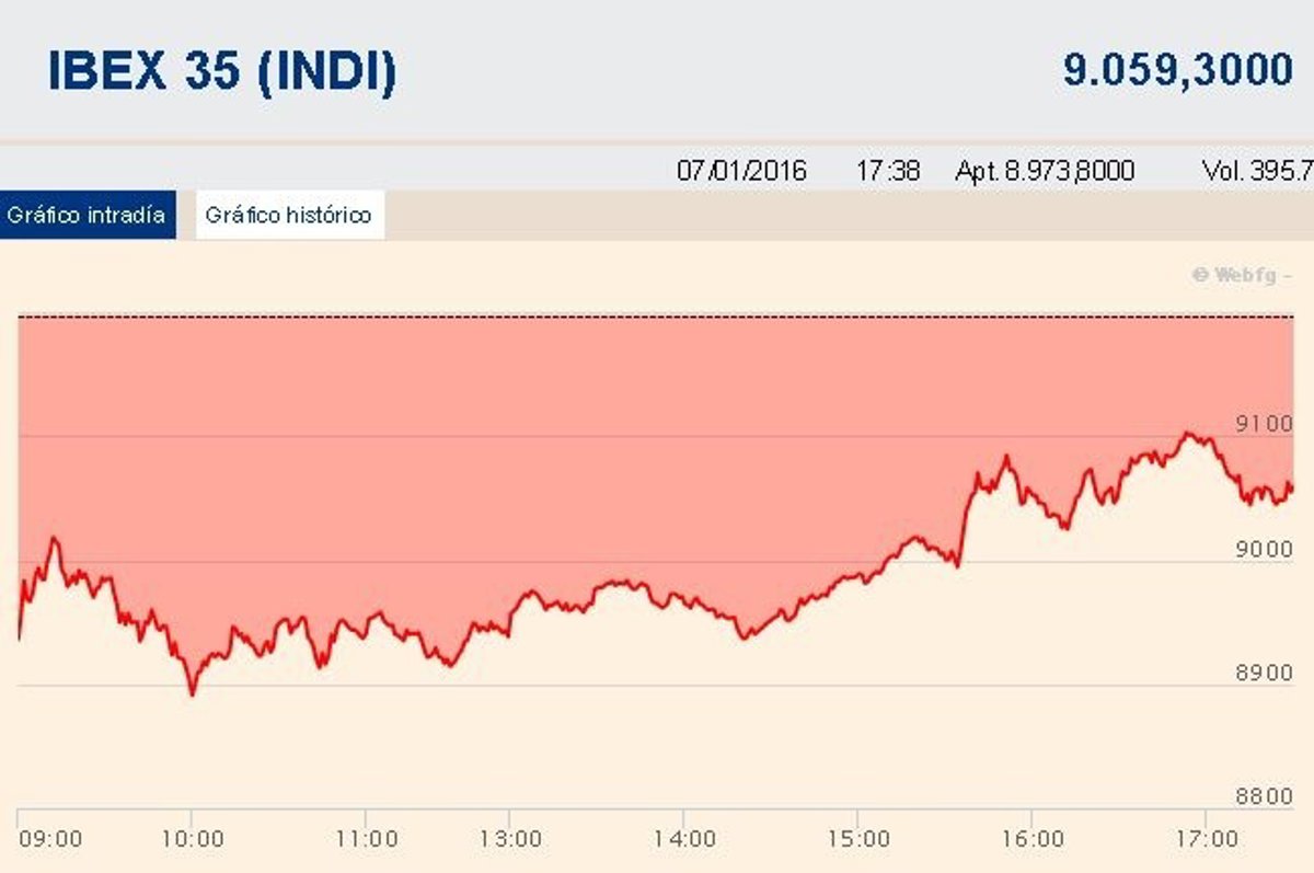 El Ibex 35 ha perdido un 1,5% al cierre de mercado y ha logrado conservar la barrera psicológica de los 9.000 puntos, cota que ha llegado a ceder en algunos compases de la sesión. El selectivo se ha anotado su segunda caída consecutiva lastrado por las bolsas asiáticas y la caída del petróleo, y se ha establecido en los 9.059 enteros.