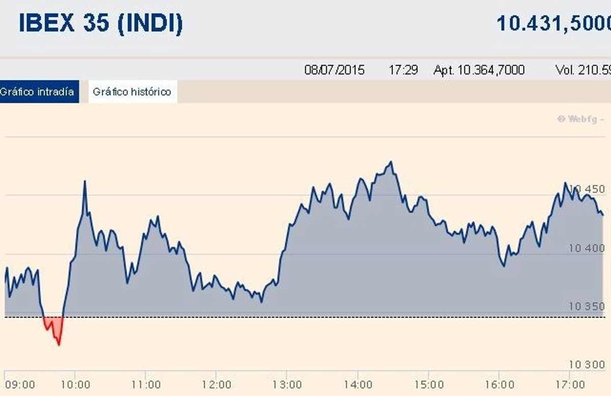 El Ibex 35 ha rebotado un 0,81% al cierre de sesión y ha frenado una racha de cuatro sesiones consecutivas a la baja ante la expectativa que suscita la nueva propuesta que presentará el Gobierno griego. El selectivo ha avanzado hasta los 10.430 puntos, aunque permanece anclado en mínimos desde febrero.