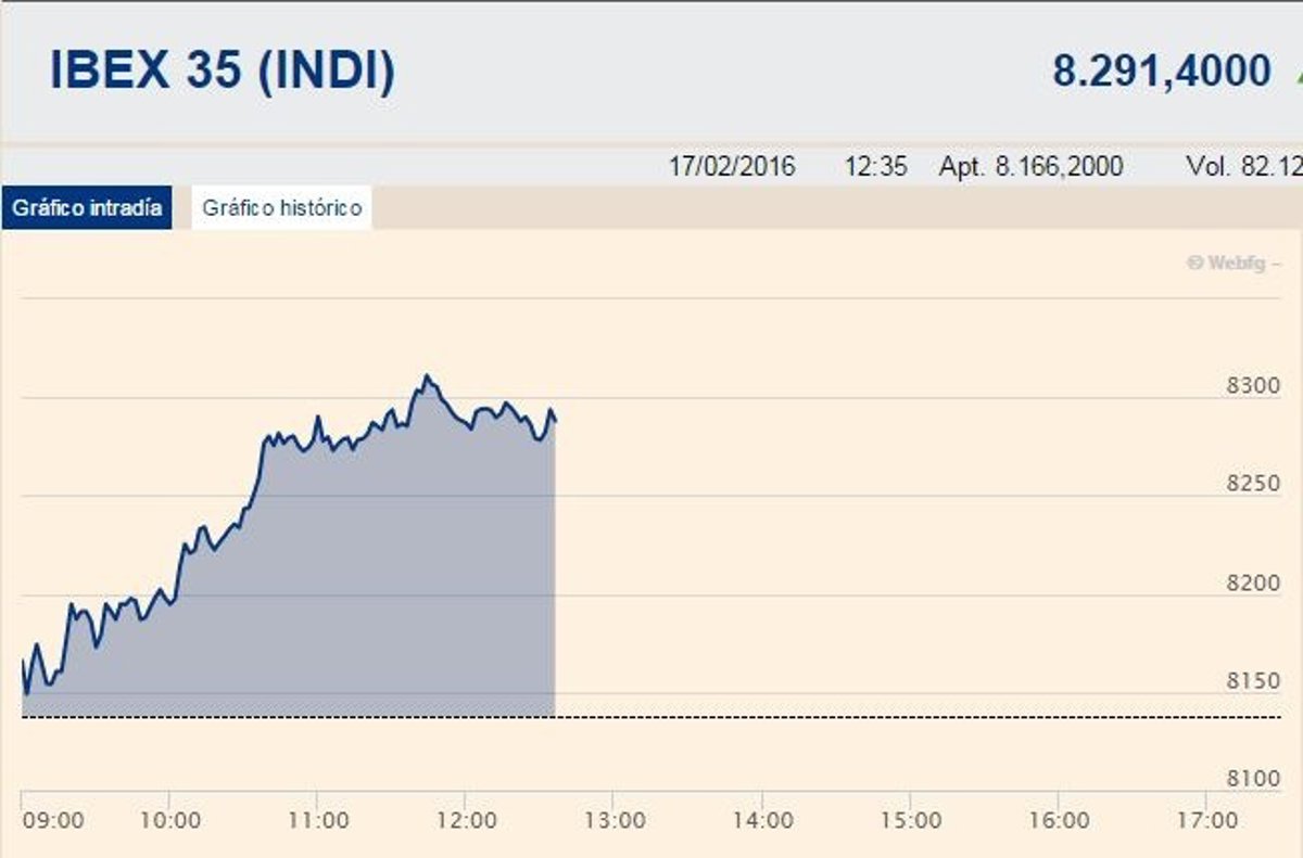 El Ibex 35 repuntaba un 1,89% en la media sesión de este miércoles, lo que llevaba al selectivo a luchar por los 8.300 enteros (8.291,2) apoyado en los grandes valores, con subidas superiores al 2%.