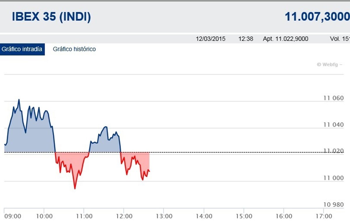 El Ibex 35 se debatía entre las ganancias y las pérdidas a media sesión (-0,08%) y resistía a perder la cota de los 11.000 puntos. El selectivo no se beneficiaba de los mínimos que marcaba la prima de riesgo española, en los 88 puntos básicos.
