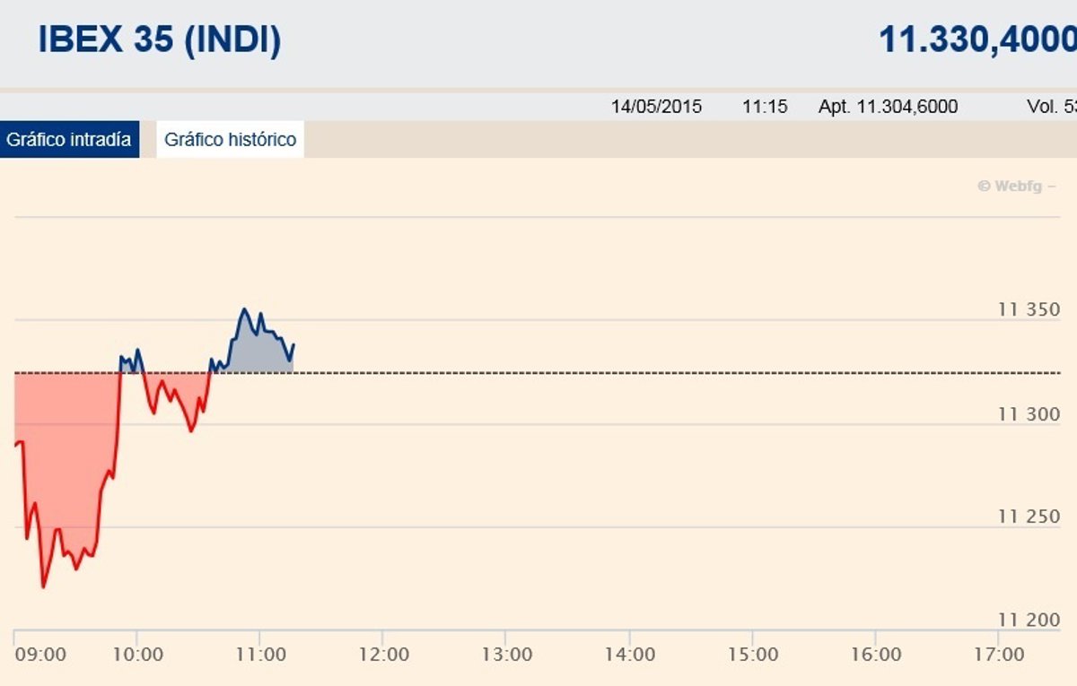 El Ibex 35 se decantaba ligeramente por las ganancias a media sesión (+0,09%) pese a la caída del 0,9% que protagonizaba Telefónica tras presentar los resultados correspondientes al primer trimestre del año. Mientras, la prima de riesgo española se estabilizaba en los 114 puntos básicos.