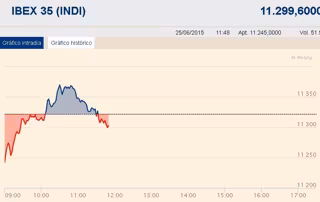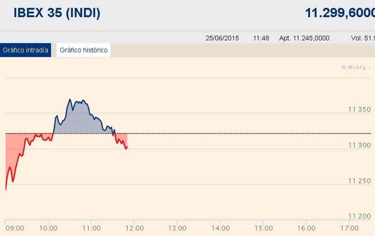El Ibex 35 no mostraba una tendencia clara a media sesión y permanecía casi plano (-0,04%), anclado en los 11.300 puntos a la espera de nuevas noticias sobre el acuerdo entre Grecia y sus acreedores. La prima de riesgo española se mantenía estabilizada en los 133 puntos básicos.
