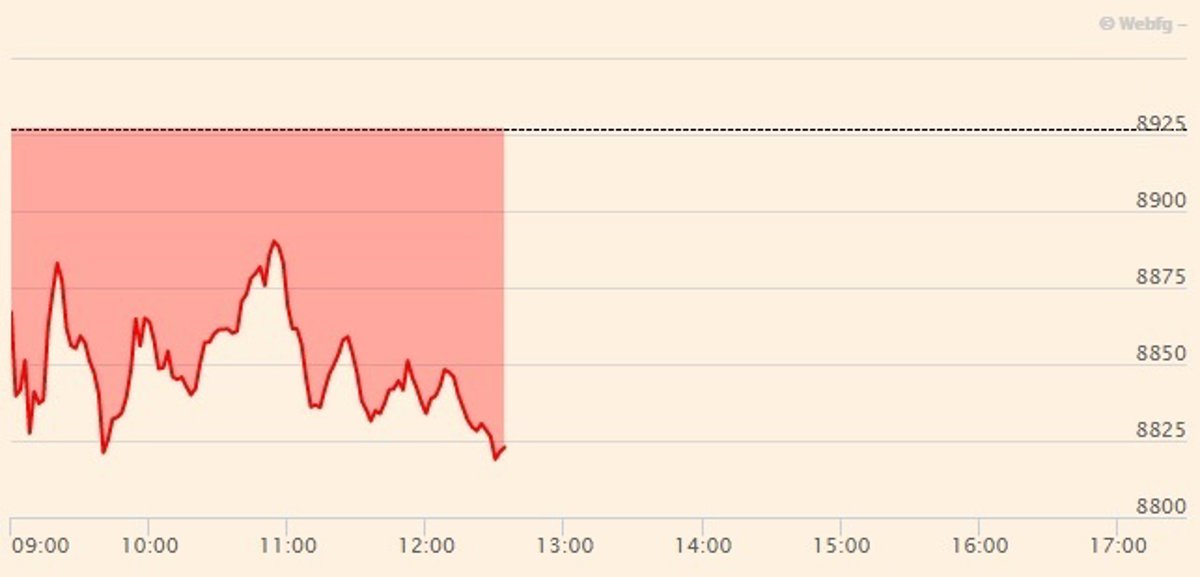 El Ibex 35 profundizaba su caída a media sesión lastrado por una nueva caída del precio del petróleo y se dejaba un 1,07%, con lo que el selectivo español perdía la barrera de los 8.900 puntos (8.831,8), con todos los valores en negativo a excepción de FCC (+0,079%).
