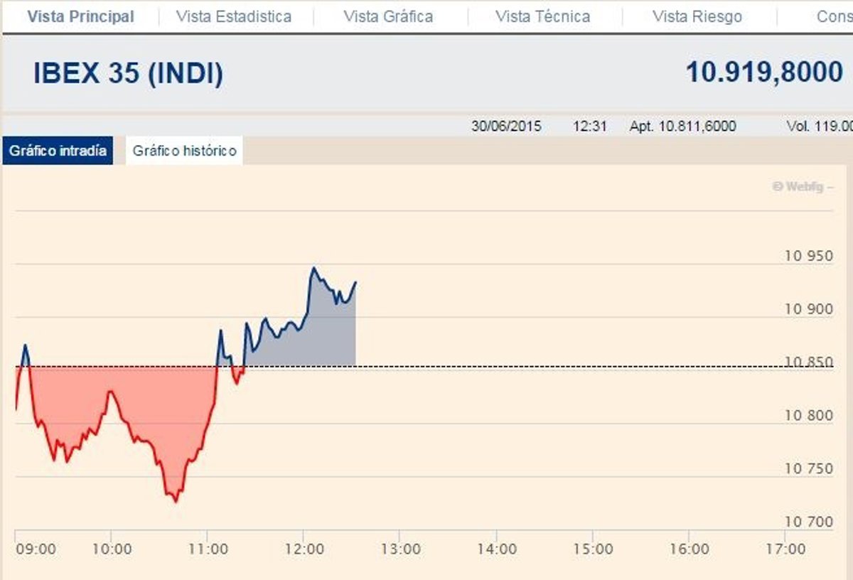 El Ibex 35 se daba la vuelta y ganaba un 0,61% en la media sesión de este martes, lo que llevaba al selectivo a luchar por recuperar los 11.000 enteros en un día en el que vence el plazo para que Grecia devuelva al Fondo Monetario Internacional (FMI) un préstamo de 1.600 millones de euros.