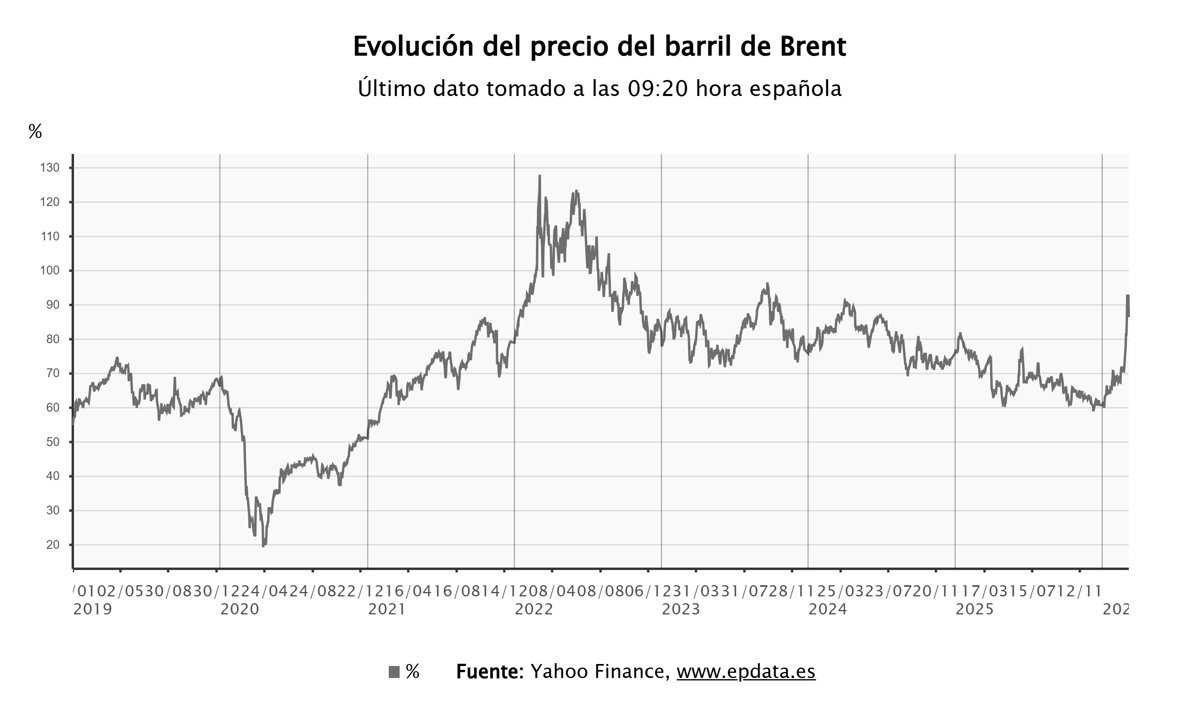 Al cierre del Ibex de este lunes, el petróleo Brent cotizaba en los 100 dólares después de rozar, durante las primeras horas de ayer, los precios del inicio de la guerra de Ucrania en 2022.