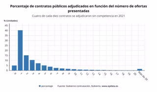 Cuatro de cada diez contratos públicos en 2021 se adjudicaron sin competencia, es decir, solo recibieron una oferta, desvela el 'Estudio anual sobre contratación pública en España 2021' elaborado por Gobierto, una plataforma de servicios de estrategia y creación de productos digitales para administraciones públicas.
