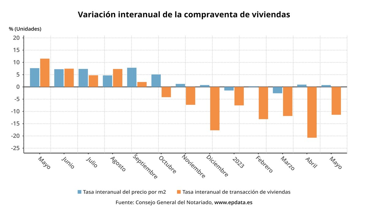 El número de compraventas de viviendas bajó un 11,4% en tasa interanual el pasado mes de mayo, hasta alcanzar las 58.880 operaciones, mientras que el precio medio del metro cuadrado se situó en 1.616 euros, un 0,8% más que en mayo de 2022, según datos del Consejo General del Notariado publicados este jueves.