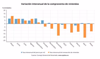 Por su parte, el precio del metro cuadrado subió un 0,8% interanual a nivel nacional el pasado mes de mayo. En 15 comunidades aumentaron los precios y en dos descendieron, principalmente en Navarra (-15,4%), Galicia (-6,7%) y País Vasco (-4,4%).