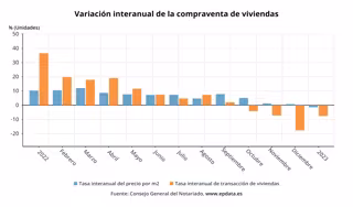 Por tipo de vivienda, las compraventas de pisos se redujeron un 7,3% interanual, hasta las 34.082 unidades, mientras que las compraventas de viviendas unifamiliares disminuyeron un 7,6% interanual, hasta las 10.487 unidades.