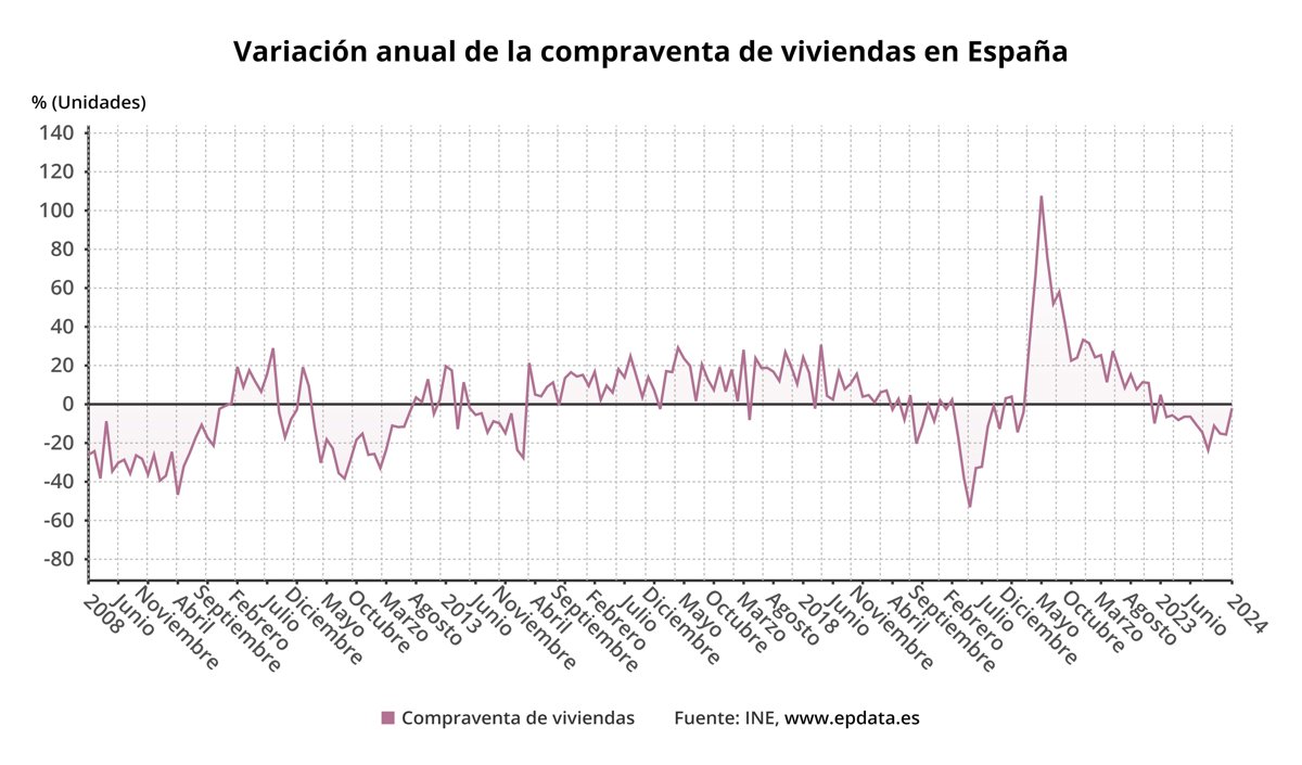 Con este descenso mensual, la compraventa de viviendas continúa 12 meses a la baja tras haber cerrado el 2023 con una caída del 9,7% en comparación con el 2022, cuando crecieron un 14,8%.