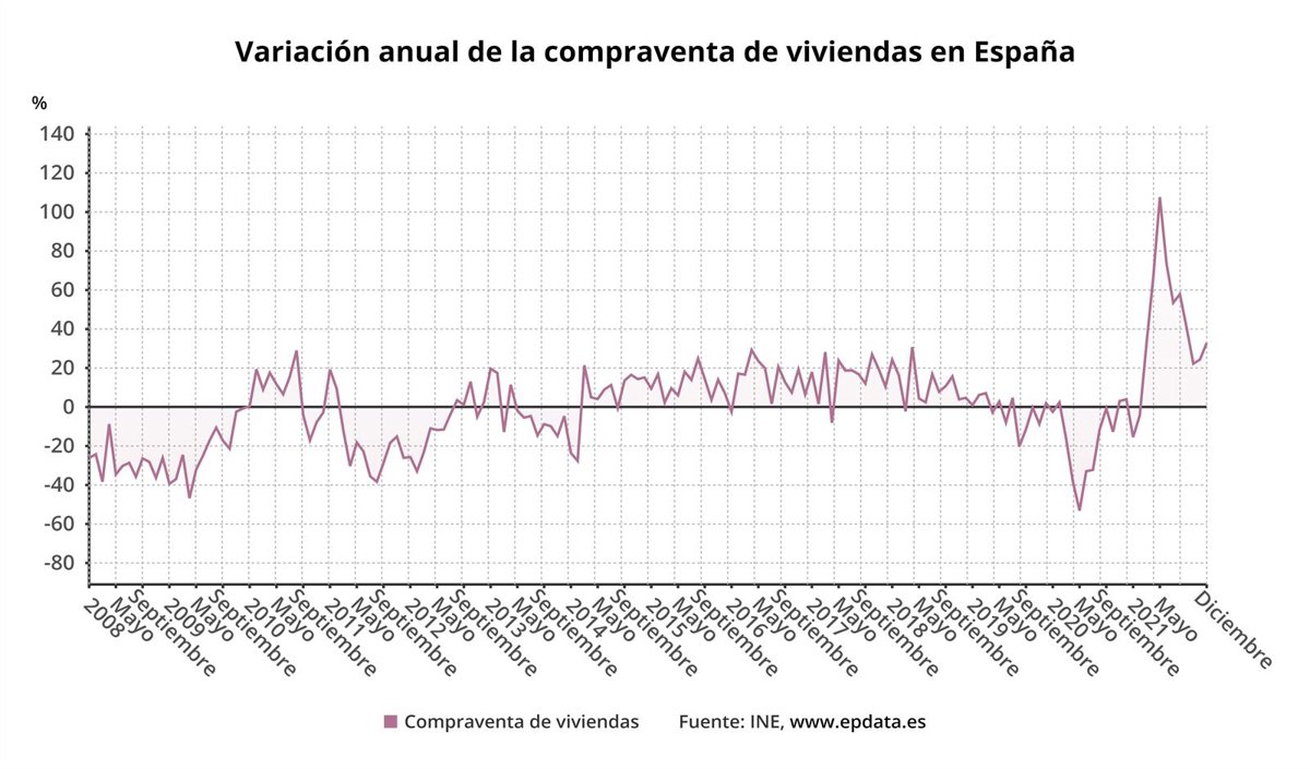 Con este repunte anual, la compraventa de viviendas pone fin a dos años de descensos tras el desplome del 17% que sufrió en 2020 por la pandemia y la caída del 0,7% de 2019.
