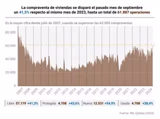La compraventa de viviendas se disparó el pasado mes de septiembre un 41,5% respecto al mismo mes de 2023, hasta un total de 61.887 operaciones, su mayor cifra desde julio de 2007, cuando se superaron las 63.000 compraventas, según ha informado este lunes el Instituto Nacional de Estadística (INE).