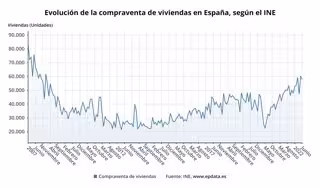 El repunte interanual de las compraventas de viviendas en junio fue consecuencia tanto del incremento de las operaciones sobre viviendas nuevas, que crecieron un 7,1%, hasta las 9.822 operaciones, como del aumento de la compraventa de pisos usados en un 21,5%, hasta sumar 48.188 transacciones.