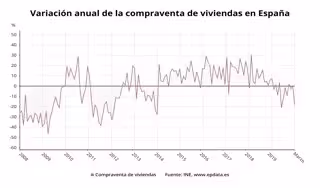 Con este retroceso, el mayor desde agosto de 2019, la compraventa de viviendas regresa a tasas interanuales negativas después de haber subido en febrero un 0,1%.