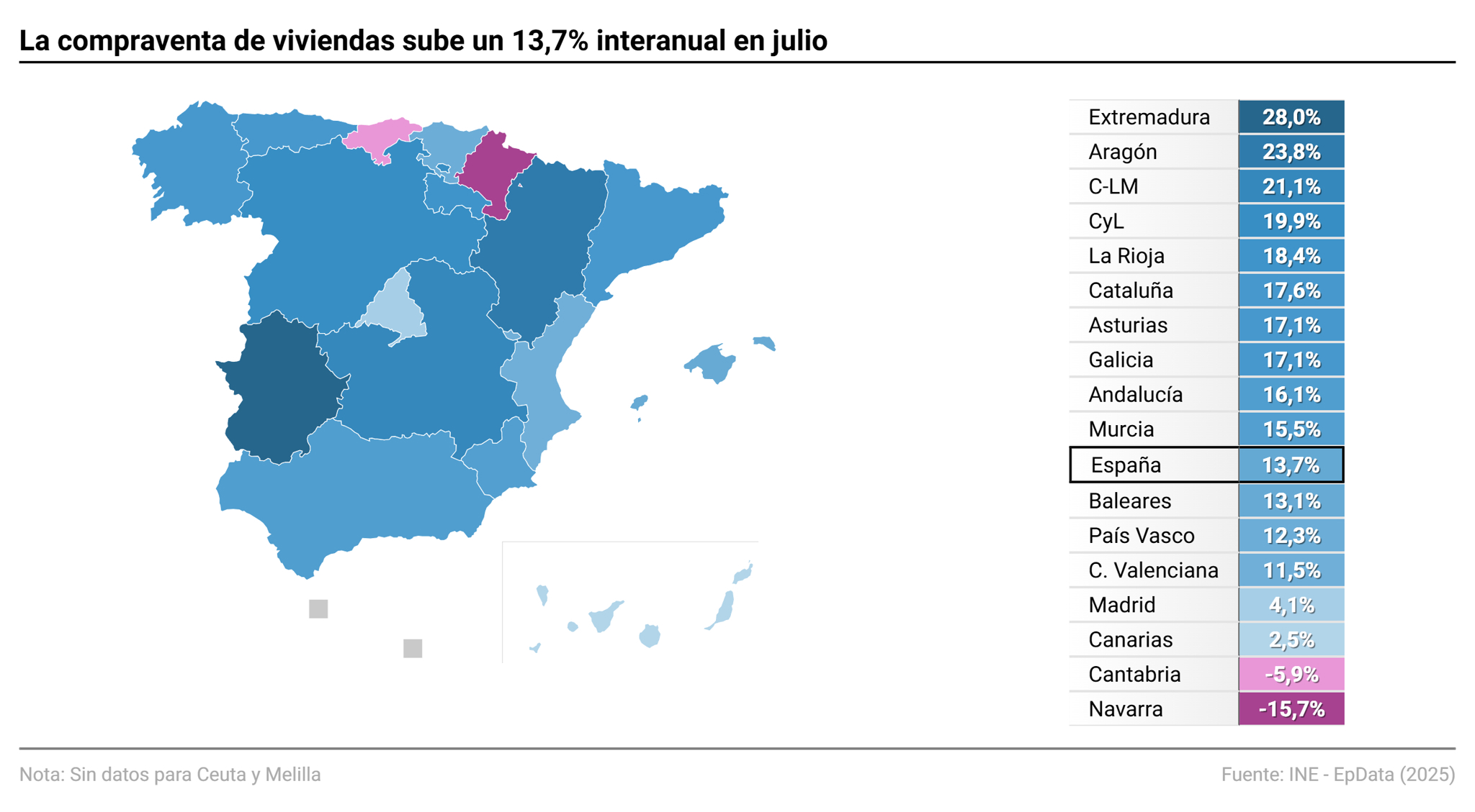 Por contra, las comunidades autónomas que presentaron los mayores aumentos fueron Extremadura (+28%), Aragón (+23,8%) y Castilla-La Mancha (+21,1%). Por su parte, Canarias (+2,5%) y Madrid (+4,1%) registraron las menores subidas.