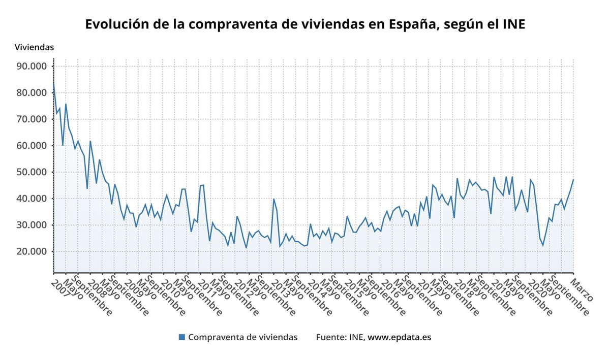 La compraventa de viviendas subió un 32,4% el pasado mes de marzo en relación al mismo mes de 2020, hasta sumar 47.332 operaciones, su cifra más alta desde julio de 2019, según ha informado este viernes el Instituto Nacional de Estadística (INE).
