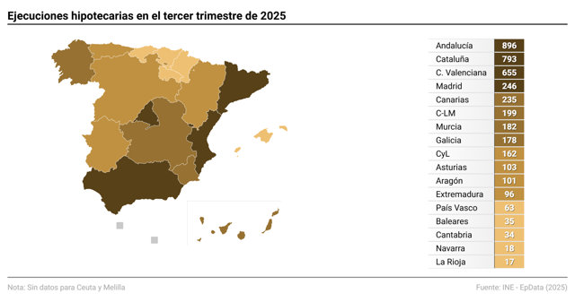 Por comunidades autónomas, Andalucía lideró las ejecuciones sobre viviendas en el tercer trimestre, con un total de 661, seguida de Cataluña (568) y Comunidad Valenciana (443). En el lado opuesto, con menos ejecuciones hipotecarias sobre viviendas, se situaron La Rioja (10), Navarra (14) y Cantabria (21).