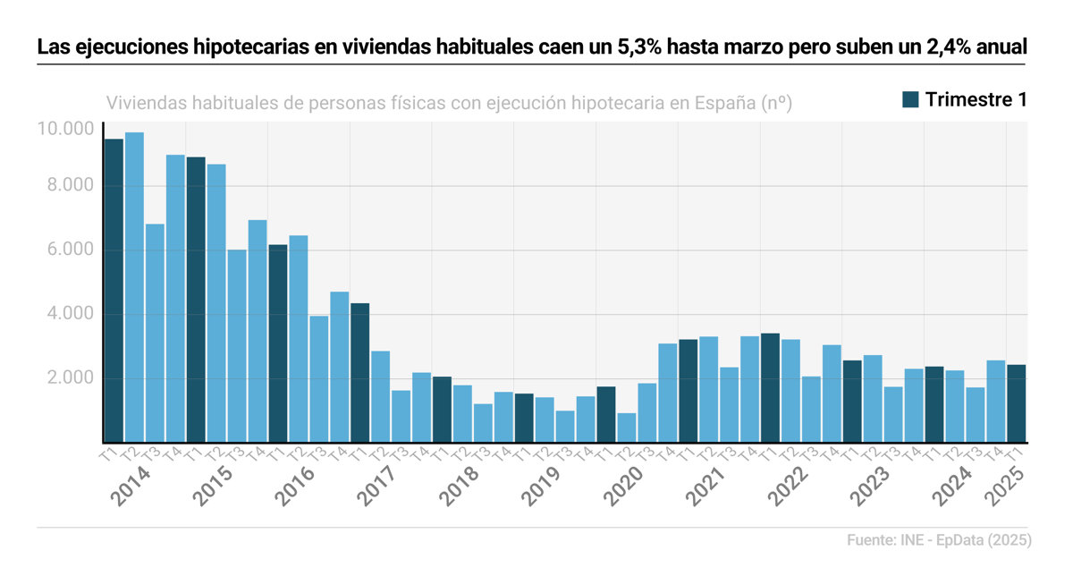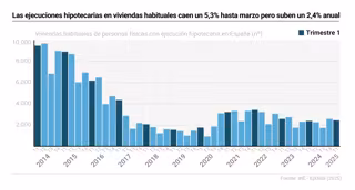 El número de ejecuciones hipotecarias sobre viviendas habituales se situó en 2.426 en el primer trimestre del año, cifra un 5,3% inferior a la del trimestre anterior, pero un 2,4% superior a la del mismo trimestre de 2024, según la estadística de ejecuciones hipotecarias publicada este miércoles por el Instituto Nacional de Estadística (INE).