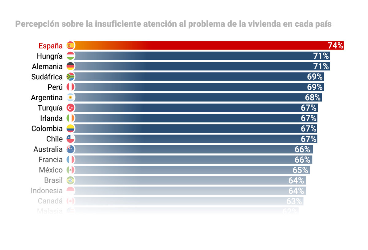 España se sitúa como el país más preocupado por el problema de la vivienda a nivel global, ya que el 74% de la población cree que no se presta la atención suficiente a esta cuestión, según se desprende del estudio 'Housing Monitor' realizado por el grupo francés de investigación de mercados Ipsos.