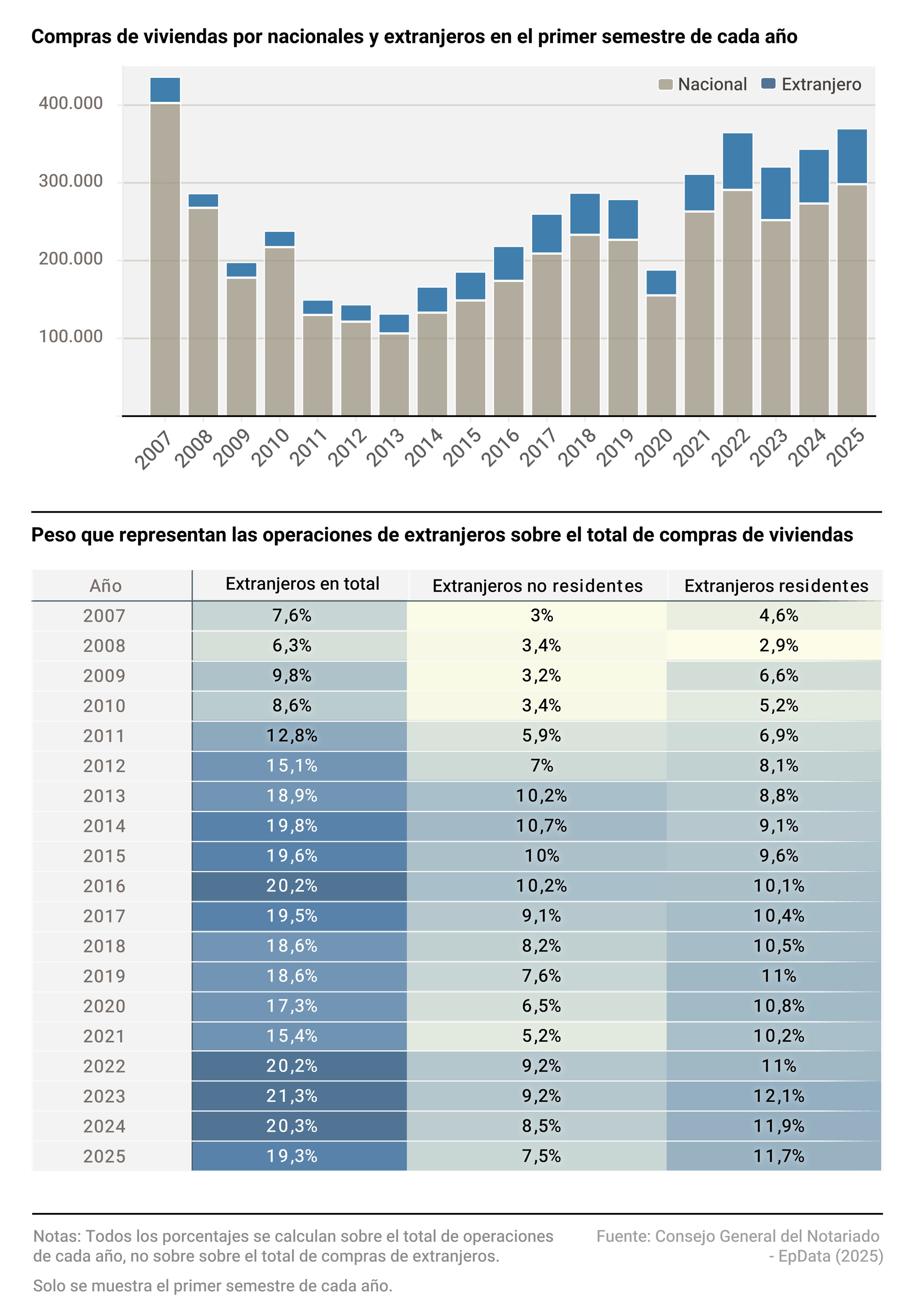 "El dinamismo de los residentes contrasta con la ligera corrección entre los no residentes, lo que refleja un cambio respecto al segundo semestre de 2024, cuando ambos grupos habían crecido de manera similar", señalan los notarios.
