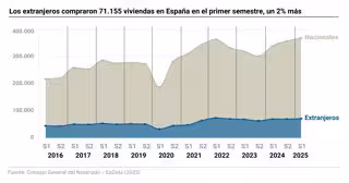 La compraventa de viviendas libres por parte de extranjeros aumentó un 2% interanual en el primer semestre respecto al mismo periodo del año pasado, hasta alcanzar las 71.155 operaciones, según un informe publicado este jueves por el Consejo General del Notariado.