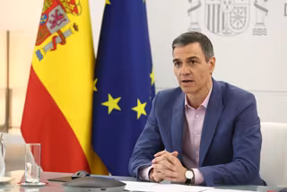 El presidente del Gobierno, Pedro Sánchez, durante la videoconferencia preparatoria a la Cuarta Conferencia Internacional sobre La Financiación para el Desarrollo de Sevilla, el 3 de junio de 2025. - MONCLOA