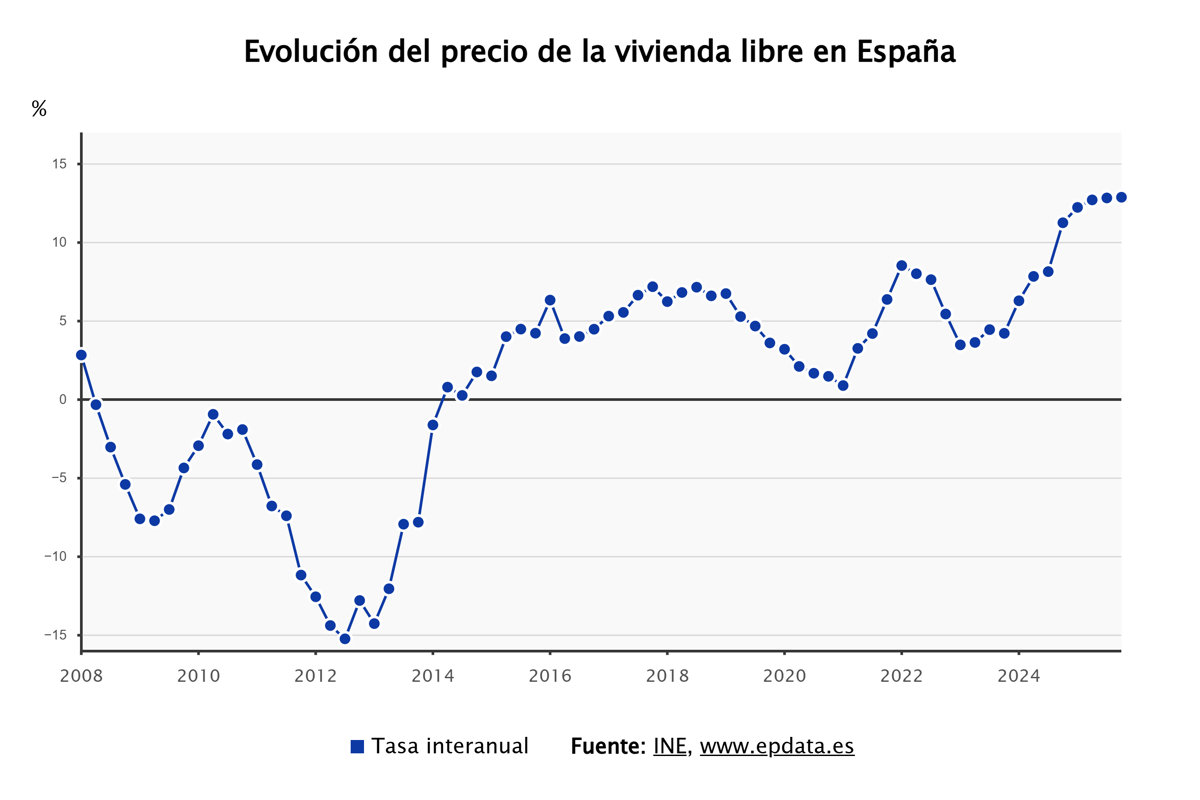 En el cuarto trimestre de 2025, el precio de la vivienda libre subió un 12,9% respecto al mismo periodo del año anterior, una décima más que en el trimestre previo y su tasa más elevada desde el primer trimestre de 2007, cuando se superó el 13% de incremento.