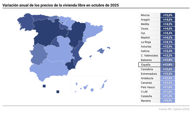 Las mayores subidas de precios se produjeron en Murcia, con un alza del 15%; Aragón (+14,6%); Ceuta y Melilla (+14,5% en ambos casos); Castilla y León (+14,4%); Madrid (+14,2%), y La Rioja, que elevó sus precios un 14,1% en relación al tercer trimestre del año pasado.