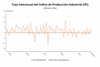 El Índice General de Producción Industrial (IPI) subió un 1,1% en octubre en relación al mismo mes de 2018, tasa 1,9 puntos inferior a la de septiembre, según ha informado este viernes el Instituto Nacional de Estadística (INE).