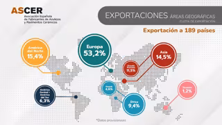 Por áreas geográficas, Europa sigue siendo el mercado natural de Tile of Spain con 6 países en entre los diez primeros mercados. "Son mercados maduros, exigentes y que aprecian el valor añadido de la cerámica española, pero que durante este año han estado muy marcados por la inflación y el consecuente freno en su mercado de la construcción", ha explicado el presidente de Ascer.