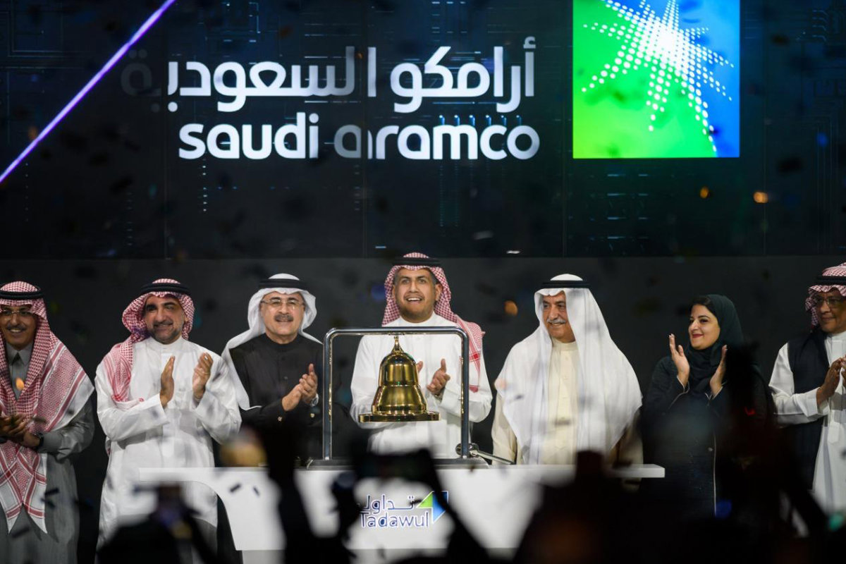 dpatop - 11 December 2019, Saudi Arabia, Riyadh: The state-owned Saudi Arabian oil company Aramco and stock market officials celebrate during the official ceremony marking the debut of the IPO of Aramco on the Riyadh Stock Exchange. Saudi oil giant Aram - -/Saudi Press Agency/dpa - Archivo