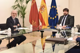 El presidente de Repsol, Antonio Brufau, ha abordado este viernes con el presidente de la Región de Murcia, Fernando López Miras, algunos de los principales proyectos que tiene Repsol en Cartagena como la construcción de una planta de hidrógeno renovable de 100 MW de capacidad, o la puesta en marcha de una planta fotovoltaica para autoconsumo.