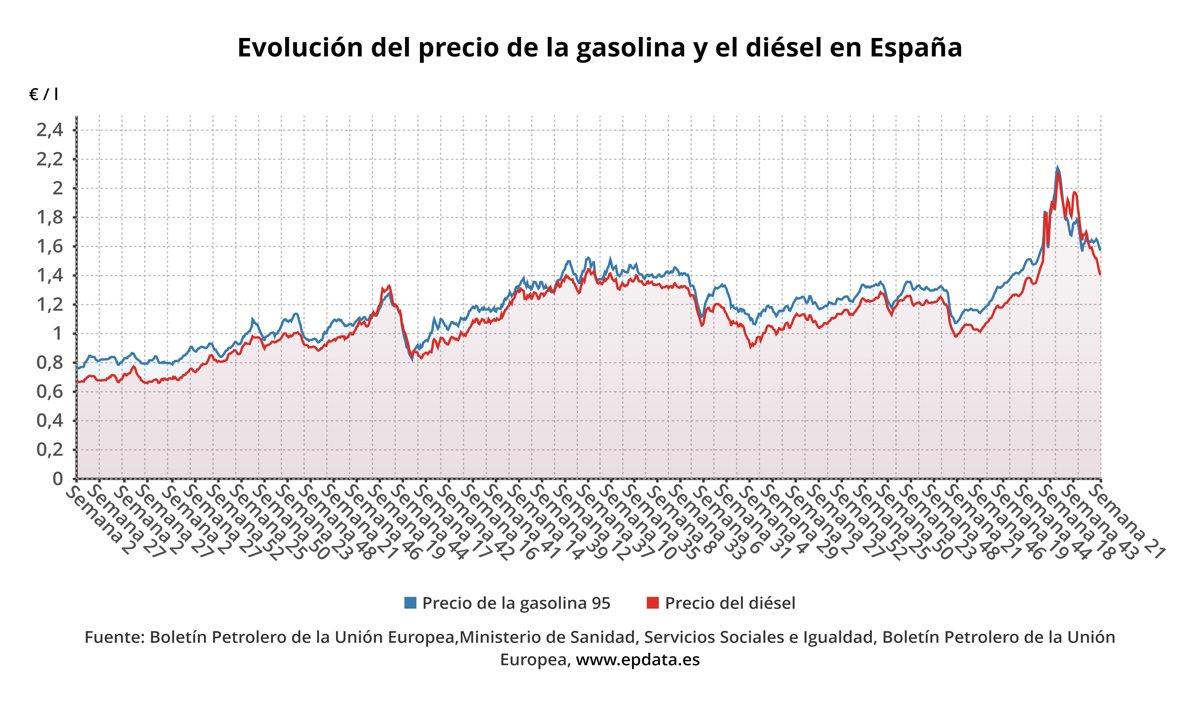 Con estos niveles de precios, ambos carburantes se mantienen lejos de los máximos que tocaron el pasado verano, cuando en julio la gasolina alcanzó los 2,141 euros y el gasóleo los 2,1 euros.