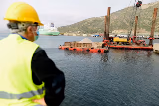 Archivo - Un obrero observa los avances de la obra de ampliación del muelle Príncipe Felipe para la carga de Gas Natural Licuado, en el muelle Príncipe Felipe, Cartagena, Murcia, (España), a 5 de febrero de 2021. - Iván Urquizar - Europa Press - Archivo