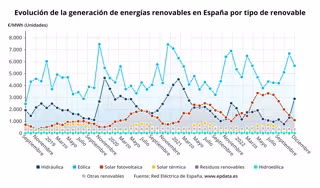 Con la información disponible a fecha de hoy, en diciembre la eólica fue la principal tecnología de generación en España. En concreto, su producción representó el 25,3% del total del 'mix' (5.661 GWh). Por su parte, la solar fotovoltaica, con 1.098 GWh anotados en diciembre,